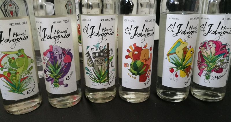 Sei prodotti al banco d’assaggio di El Jolgorio. Tutti dall’Oaxaca, ma fatti con 6 agavi specifiche. Espadin, agave semi selvatica che per via della sua veloce maturazione, in genere inferiore ai 10 anni, ed al suo grande formato è la più utilizzata dai Mezcaleros; profumi erbacei, leggeri e sottili, abbastanza pulito al palato. Mexicano è invece un’agave rara che cresce su terreni molto umidi, 10 anni di maturazione anche per lei, ci regala un Mezcal incredibilmente potente e complesso di note fumose e legnose, dalla lunga persistenza.
