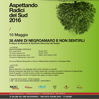 Per gli appassionati di uno dei vitigni principe della Puglia, ”Aspettando Radici del Sud” riserva un’appassionante approfondimento del Negroamaro attraverso la degustazione di sette diverse etichette prodotte dalla storica azienda salentina Apollonio. Martedì 10 maggio, presso il ristorante Aqua del Dune Resort affacciato sul mare di Porto Cesareo il noto vitigno a bacca rossa mostrerà la sua versatilità e piacevolezza apprezzabili anche nella calda stagione di maggio. Il programma della serata, organizzata in collaborazione con Slow Wine Puglia, prevede di iniziare da due tipologie di rosato, il primo affinato e invecchiato in legno e l’altro in acciaio. Si prosegue poi con quattro rossi da Negroamaro fino a arrivare all’annata del 1978. La conclusione della degustazione è affidata infine a un passito da Negroamaro. A partire dalle ore 20 i vini protagonisti della serata saranno introdotti e raccontati da Massimiliano Apollonio con il prezioso contributo di Francesco Muci, responsabile Slow wine della Puglia. Dalle ore 21 saranno servite alcune pietanze preparate dallo chef Cosimo Russo per completare il profilo espressivo dei vini nell’abbinamento coi cibi e meglio comprenderne l’evoluzione negli anni.