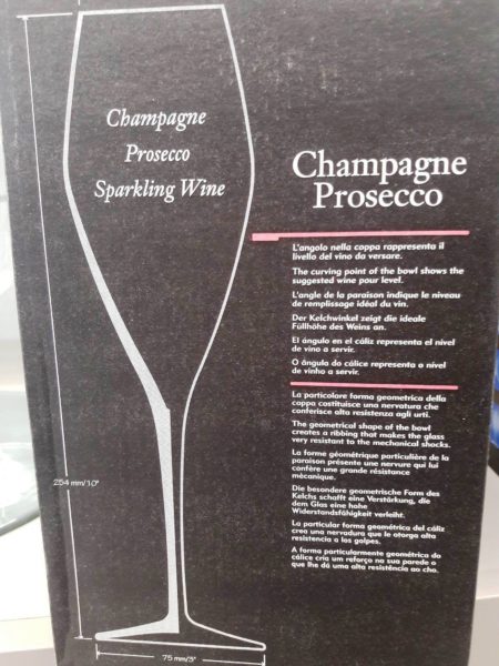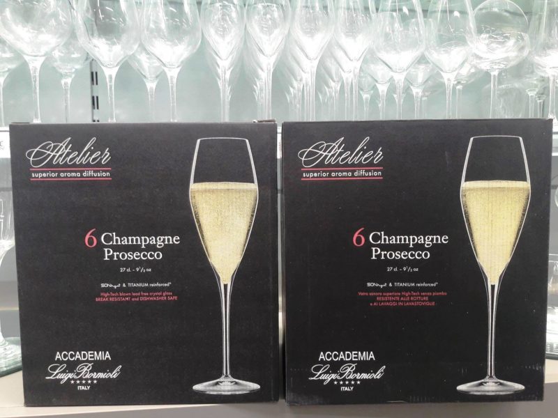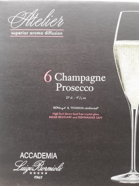 Nel mirino della campagna #nonsoloprosecco di vinialsuper finisce così un colosso del vetro Made in Italy, la Luigi Bormioli di Parma. Confezione nera ed elegante per l’intera linea “Atelier”, di cui fa parte il pack di 6 calici da 27 cl (9½ oz) su cui la parola “Prosecco” campeggia al posto di “spumante”.