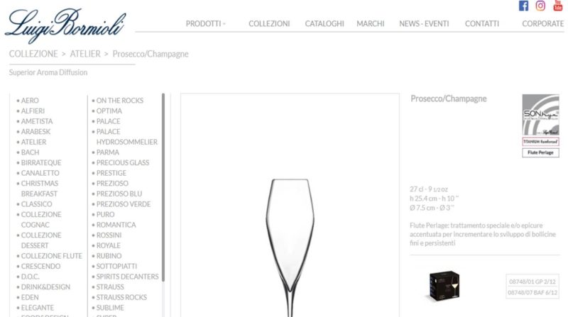 Una “svista” presente anche sul sito web della Luigi Bormioli: stesso riferimento al Prosecco, accostato genericamente allo Champagne nella sezione dedicata alla collezione “Atelier – Superior Aroma Diffusion”.