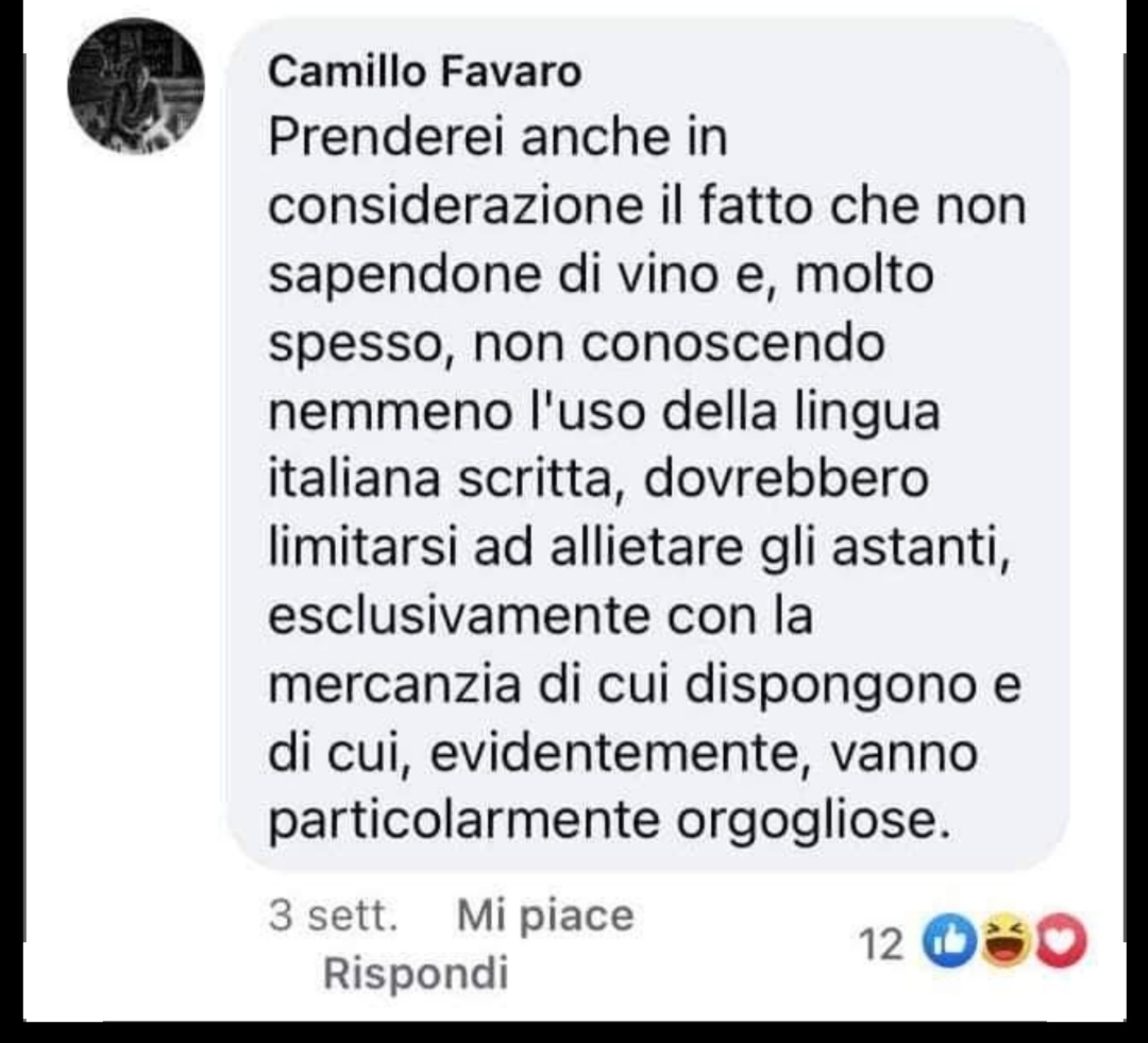 Così il produttore piemontese, socio Fivi, in un commento affidato al social Facebook, che ci è stato segnalato da una lettrice. Timida ma decisa la reazione di una sola utente, una produttrice veneta con la quale Favaro si scusa, senza però cancellare la sparata, o riuscire a rimediare con parole davvero sentite.