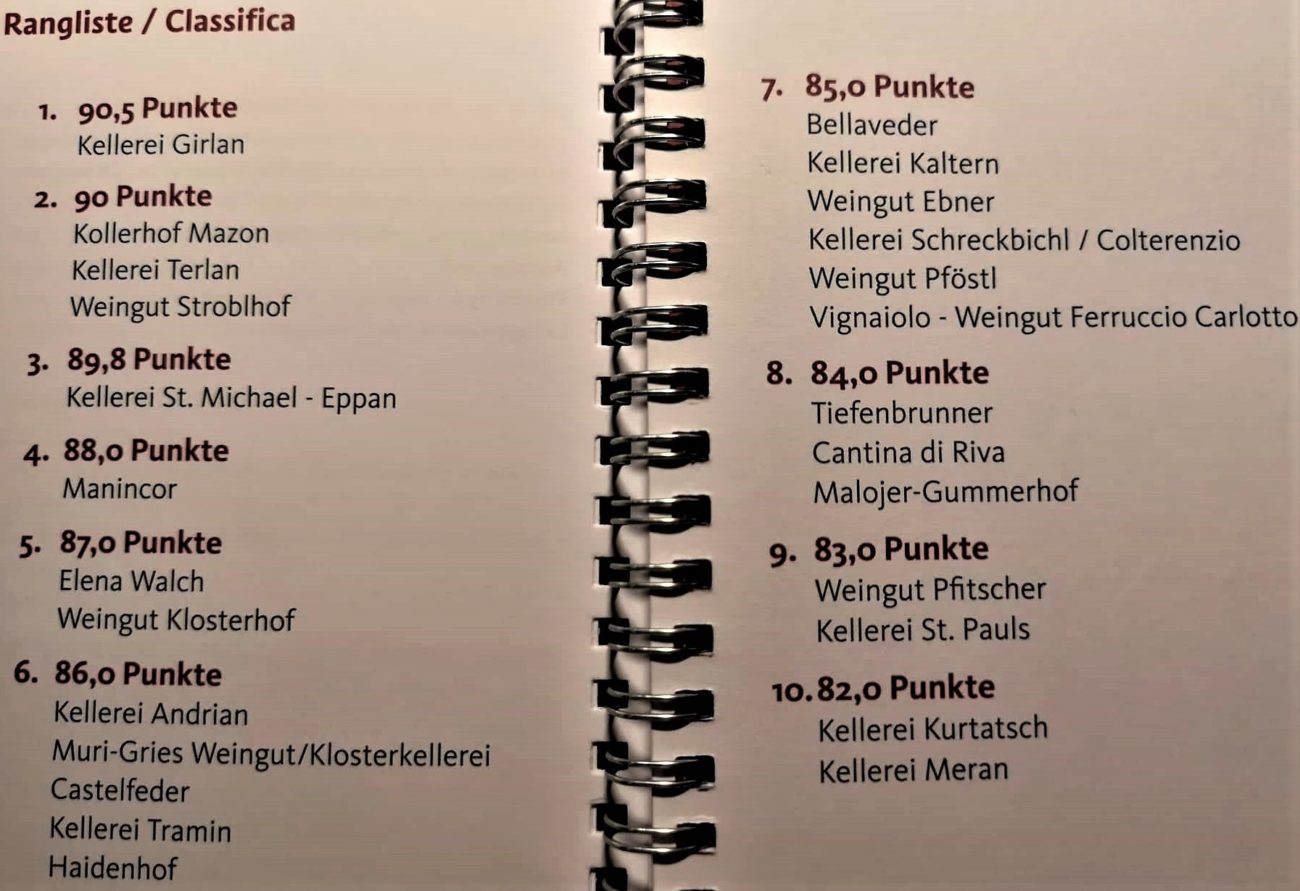 Di seguito quelli che hanno ottenuto un punteggio superiore a 85/100. Otto delle etichette individuate da WineMag alla cieca rientrano anche nella classifica stilata dalla giuria del Concorso, che nel 2019 ha premiato solo etichette dell’Alto Adige e del Trentino (26 in totale, considerando vari pari merito, tra i 90,5 e gli 82/100).