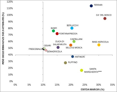 Come mostra la tabella, sono stati analizzati i numeri di grande imprese del vino in Italia. Da Ferrari a Masi, da Berlucchi a Santa Margherita, passando per Duca di Salaparuta, Sella e Mosca, Frescobaldi e Antinori. Osservando le prime 15 imprese italiane per marginalità unitaria, per circa l’80% di esse il peso del magazzino rispetto al fatturato è superiore al 50%, una circostanza che si spiega con la focalizzazione produttiva su vini affinati che, prima di essere veicolati sul mercato, alimentano il valore degli stock per più esercizi. Rare sono invece le aziende che pur registrando ottime marginalità rilevano un valore delle rimanenze non particolarmente elevato: si tratta di imprese con una forte notorietà e reputation del proprio brand aziendale sui mercati esteri, una politica sostenibile solo dalle pochissime realtà che possono sostenere ingenti investimenti promozionali. In questo contesto, le strategie aziendali volte ad un riposizionamento verso l’alto sul fronte dei prezzi di vendita e dei margini unitari spesso si traducono nel potenziamento dei processi e delle strutture di affinamento. La riqualificazione del portafoglio prodotti verso vini invecchiati ha un notevole impatto sull’equilibrio finanziario delle imprese e soprattutto sul ciclo di generazione di cassa. L’esborso per i necessari investimenti insieme all’assorbimento di capitale circolante (aumento delle rimanenze e allungamento dei tempi di incasso rispetto al momento in cui si sostengono i costi di produzione) sono, per molte imprese, forti deterrenti ad intraprendere una strategia di diversificazione verso il prodotto pregiato. Un piano industriale che voglia perseguire questa strategia di crescita non può prescindere da una struttura di finanziamento a medio e lungo termine, sempre meno disponibile nell’offerta del sistema bancario. Da qui la valida alternativa del mercato obbligazionario. Tanto più se il valore del magazzino, che per le 15 imprese considerate supera i 400 milioni di euro nei bilanci 2014, può essere utilizzato a “garanzia” del debito e quindi a riduzione del suo costo.