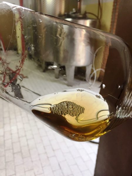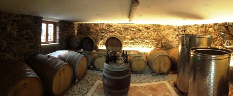 La degustazione avviene in una piccola cantina, tra le barrique in legno di rovere usate, disposte sul perimetro. Al centro una botte su cui poggeranno i calici. Il primo vino è uno spumante, “L1“, dedicato alla vertebra fratturata durante un incidente in vigna su un trattore, dove Davide rischiò la vita.