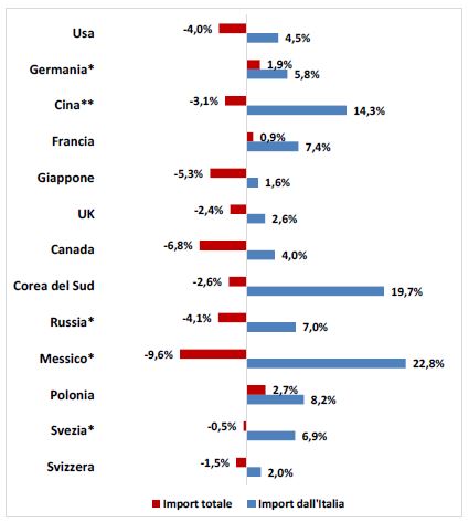 Se negli Usa le importazioni totali di prodotti agroalimentari hanno fatto registrare (a valore) un calo del 4% nel periodo analizzato, quelle dal nostro paese sono invece cresciute del 4,5%. Trend analogo in Canada: a fronte di una riduzione dell’import agroalimentare complessivo del 6,8%, quello di prodotti italiani è aumentato del 4%.