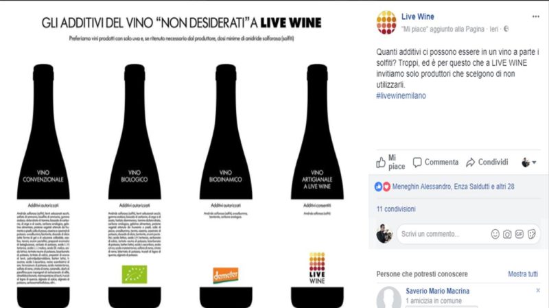 “Quanti additivi ci possono essere in un vino a parte i solfiti? Troppi, ed è per questo che a Live Wine invitiamo solo produttori che scelgono di non utilizzarli”. Segue l’infografica, nemmeno troppo leggibile nelle parti testuali (ma questo non conta ai fini dello sputtanamento) con l’elenco di una sfilza di additivi utilizzati per la produzione dei vini convenzionali, biologici, biodinamici.