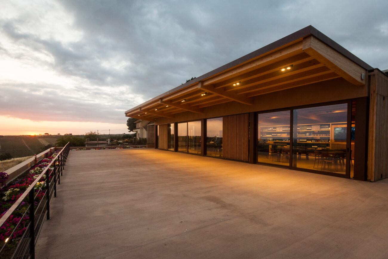 Si arriva quindi nella sala degustazione, con due grandi aperture. Un punto funzionale e al contempo panoramico, con vista tra il mar d’Africa e le verdi colline di Menfi, dove sorgono i vigneti di Mandrarossa.