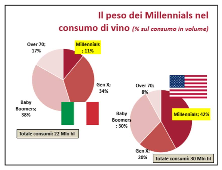 L’universo di riferimento dello studio sono stati i Millennials (popolazione di età compresa tra 18-35 anni in Italia e 21-35 in USA – per legal drinking age). Si tratta della generazione su cui stanno puntando tutti i produttori e che in futuro sostituirà – in particolare in Italia – quei consumatori di vino che per anni ne hanno sostenuto il consumo in virtù di un approccio più tradizionale, per il quale questa bevanda ha spesso ricoperto un ruolo funzionale (di alimento) più che voluttuario. Nel caso degli Stati Uniti, dove questo approccio non è mai esistito, i Millennials rappresentano già oggi la generazione che in quantità consuma più vino di qualsiasi altra: 42% di tutti i consumi.