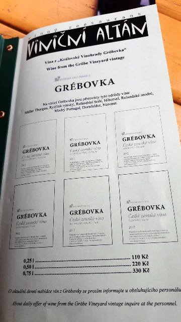 Le varietà coltivate sono Müller Thurgau, Riesling, Pinot Grigio, Hibernal, Pinot Noir, Blau Portogallo, Dornfelder e Neronet, su una superficie di 1,6 ettari. Vengono tutte vendemmiate e vinificate a Praga dalla cantina Sklep Grébovka di Iveta Bulánková e Pavel Bulánek. Moglie e marito gestiscono sia il vigneto che le attività del wine bar Vinicni Altan, divenuto luogo di incontro e dibattito sul mondo del vino, sede di mostre e ritrovo per molti artisti praghesi, nonché incantevole location per cerimonie private e matrimoni.