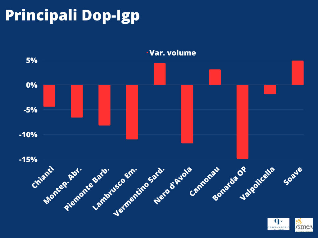 Nel segmento delle Indicazioni geografiche, ancora segni meno per le principali tipologie. Tra i primi 10, solo il Vermentino di Sardegna, il Puglia Igp e il Cannonau in dinamica positiva (+4%, +2% e +3% rispettivamente in volume). Chianti in regressione (-4.4%), mentre migliora leggermente la situazione del Montepulciano d’Abruzzo, che da -14% di marzo è arrivato a -9% a giugno per risalire a -6.6% di settembre. In forte discesa il Nero d’Avola siciliano, a -12%, così come la pattuglia dei Salento Igt (-9%), il Lambrusco emiliano (-11%), la Bonarda dell’Oltrepò pavese (-15%) e il Verdicchio dei Castelli di Jesi (-18,9%). Tra i veneti, Valpolicella a -2% e Bardolino a -3.4%. Il Soave continua a essere positivo, chiudendo il conto dei nove mesi a +5%.