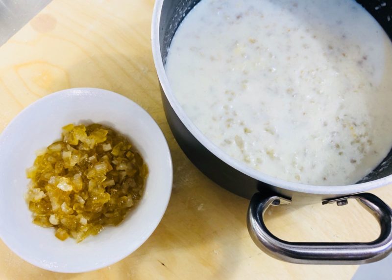 Versiamo in un pentolino largo il latte e il grano cotto. Uniamo lo zucchero, lo strutto, la cannella e la buccia di limone. Lasciamo cuocere a fuoco moderato per una decina di minuti circa, mescolando di continuo.