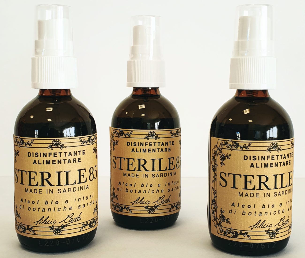 Sterile 85° è un disinfettante innovativo, che ha come base primaria alcol biologico prodotto naturalmente dalla fermentazione alcolica dello zucchero. Solitamente utilizzato per i distillati, per gli Amari, i Vermouth e i Mirto che sanno di Sardegna, in questo caso è racchiuso in una bottiglietta spray da 50 ml unito a un infuso di erbe spontanee sarde.