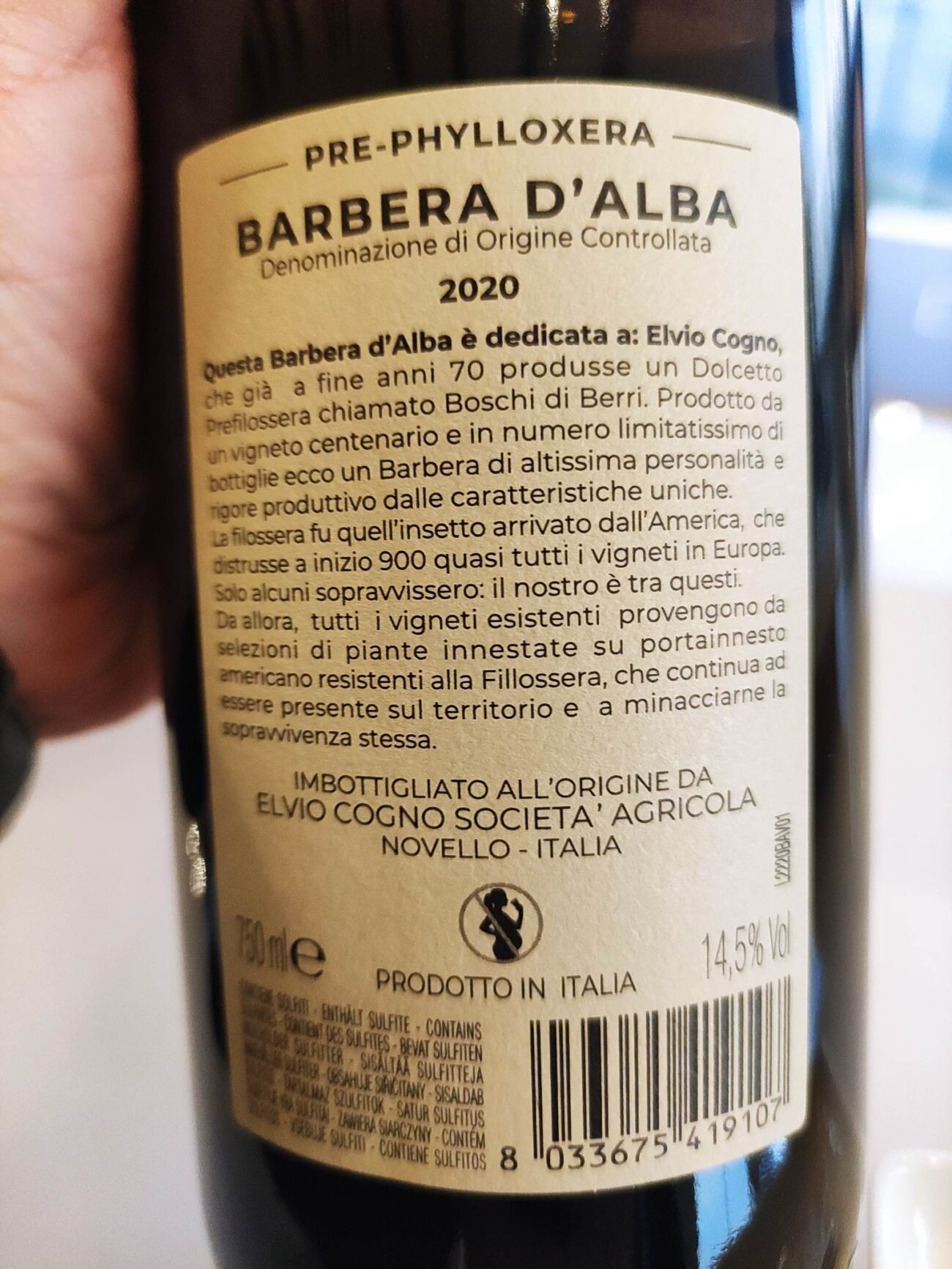 Le viti a piede franco e maritate arrivano a superare i 120 anni, regalando una produzione di 1.800 bottiglie di Barbera d’Alba “Pre-Phylloxera” l’anno. Una «vendemmia speciale» per chiunque abbia «la fortuna e l’onore» di poter scegliere i grappoli migliori, da piante divenute monumenti alla natura e alla sua resilienza. Per tenerle in vita, la Elvio Cogno adotta costosi accorgimenti.